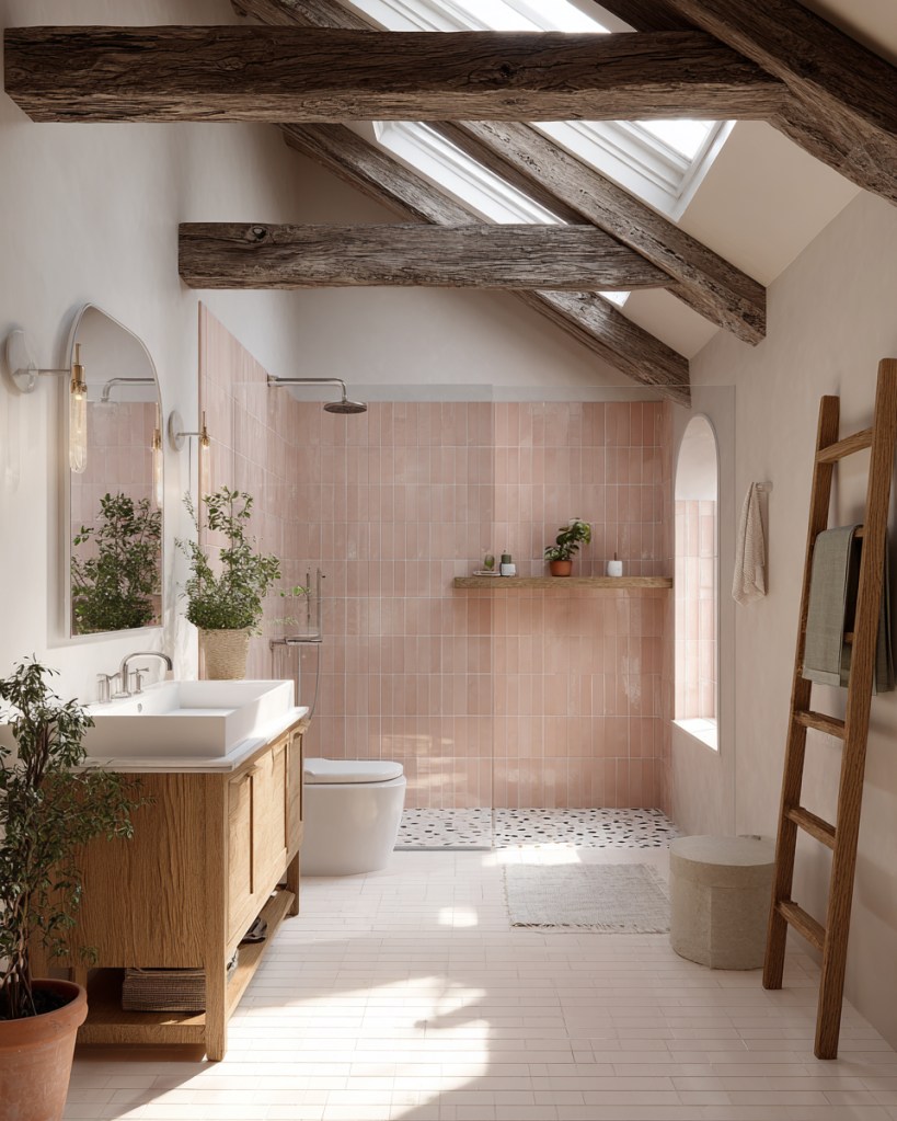 Bathrooms naturally contain lots of smooth, hard surfaces, making texture mixing particularly important for warmth and visual movement.