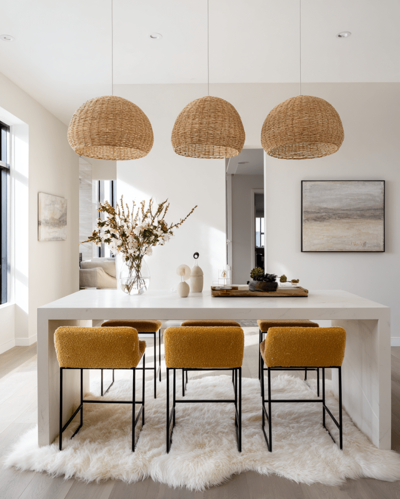 This interior is a perfect example of the rule of three textures. Soft velvet cushions and boucle upholstery provide plush comfort. Smooth glass and ceramic surfaces add sleek sophistication. The woven jute rug and natural wood introduce organic warmth. The space achieves visual balance by using these three distinct texture families. This approach also provides enough variety to create depth and interest without overwhelming the eye. The result is a harmonious, layered interior where each texture plays a distinct role in the overall composition.