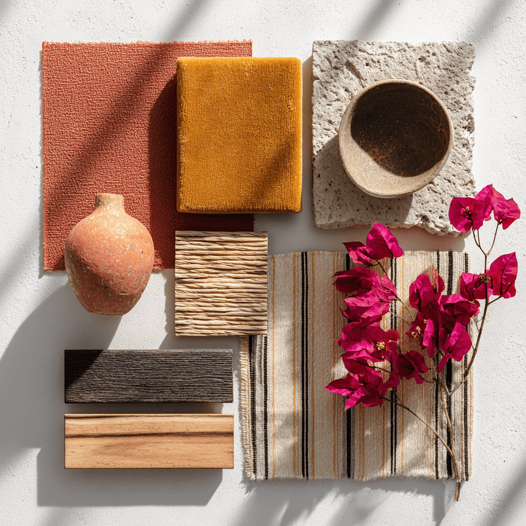 Terracotta became our starting point. That classic Mexican clay color that’s earthy but also surprisingly sophisticated. We paired it with mustard yellow, which gives you that sun-baked adobe feeling without being too bright or aggressive.